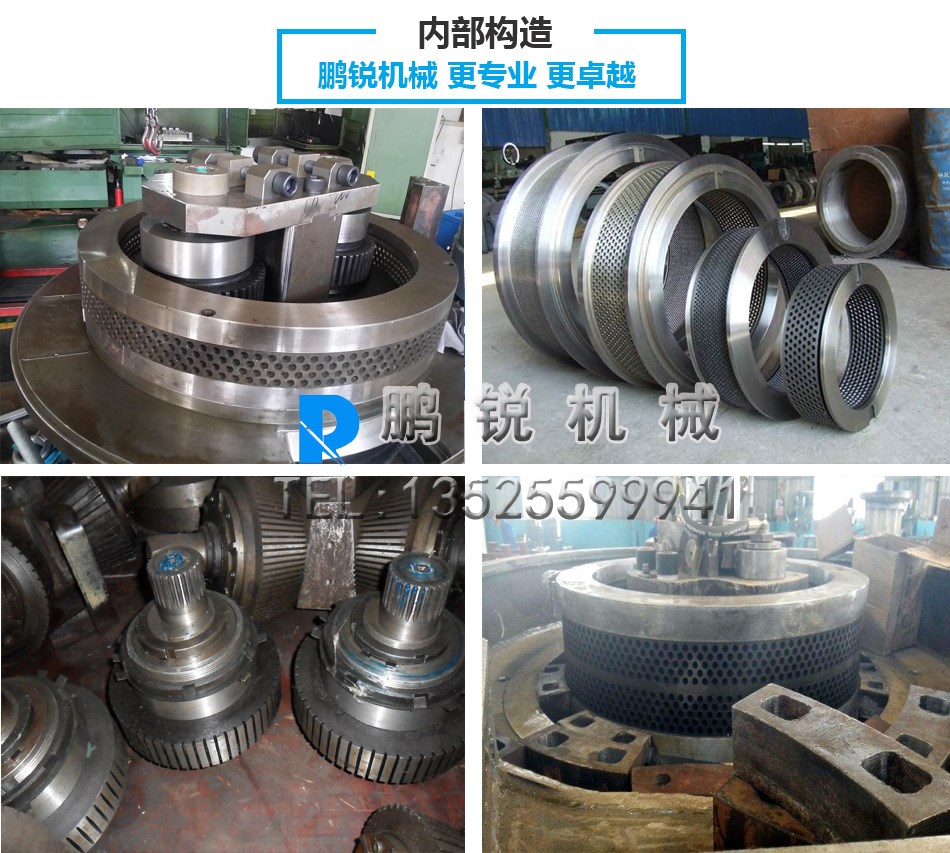 物料經(jīng)過(guò)預(yù)處理之后進(jìn)入制粒機(jī)內(nèi),(通過(guò)離心力的作用,使得物料不斷地圓周運(yùn)動(dòng)附著在壓模的內(nèi)壁面上,形成均勻的環(huán)形料層,而通過(guò)壓輥對(duì)付著的物料不停地旋轉(zhuǎn)擠壓,使其強(qiáng)行進(jìn)入環(huán)模孔中成型,并不斷的向外擠出)通過(guò)壓輥和壓盤(pán)不停的旋轉(zhuǎn)和擠壓,使物料隨著轉(zhuǎn)動(dòng)進(jìn)入到模具孔內(nèi),經(jīng)過(guò)一定時(shí)間的保壓,達(dá)到一定的密度和強(qiáng)度的顆粒被擠出壓膜孔外,并由切刀切割成所需要的長(zhǎng)度并推送到出料口處。