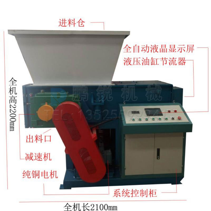 單軸塑料撕碎機主要由動刀輥(主軸+刀片)、定刀,承載箱體,箱體支架,進料系統,液壓推料系統,動力系統,電器控制系統組成。工作時允許物料中有少量的輕薄金屬物件。物料大小可根據篩網孔徑的大小進行調節。處理物料為:PE,PP,ABS,膠頭料,塑料、機頭料等。處理產量為:300kg/h-1500kg/h,型號為600和800型,處理后的尺寸可根據客戶要求進行調整。